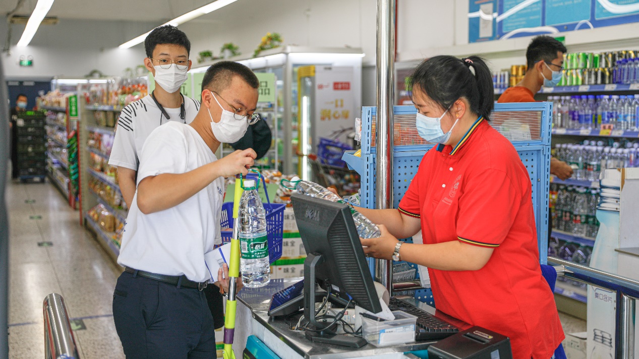 “迎新的这两天,我们服务在商贸迎新一线。在店里人员短缺的情况下,大家每天坚持17小时连续工作,不间断地收货、上货、结账、送货,让每一个进店的学生都能买到所需商品,全力保障了迎新工作顺利进行。虽大部分员工腿站肿了,眼睛熬红了,但大家都很自豪,因为我们是共克时艰的后勤人、商贸人。”