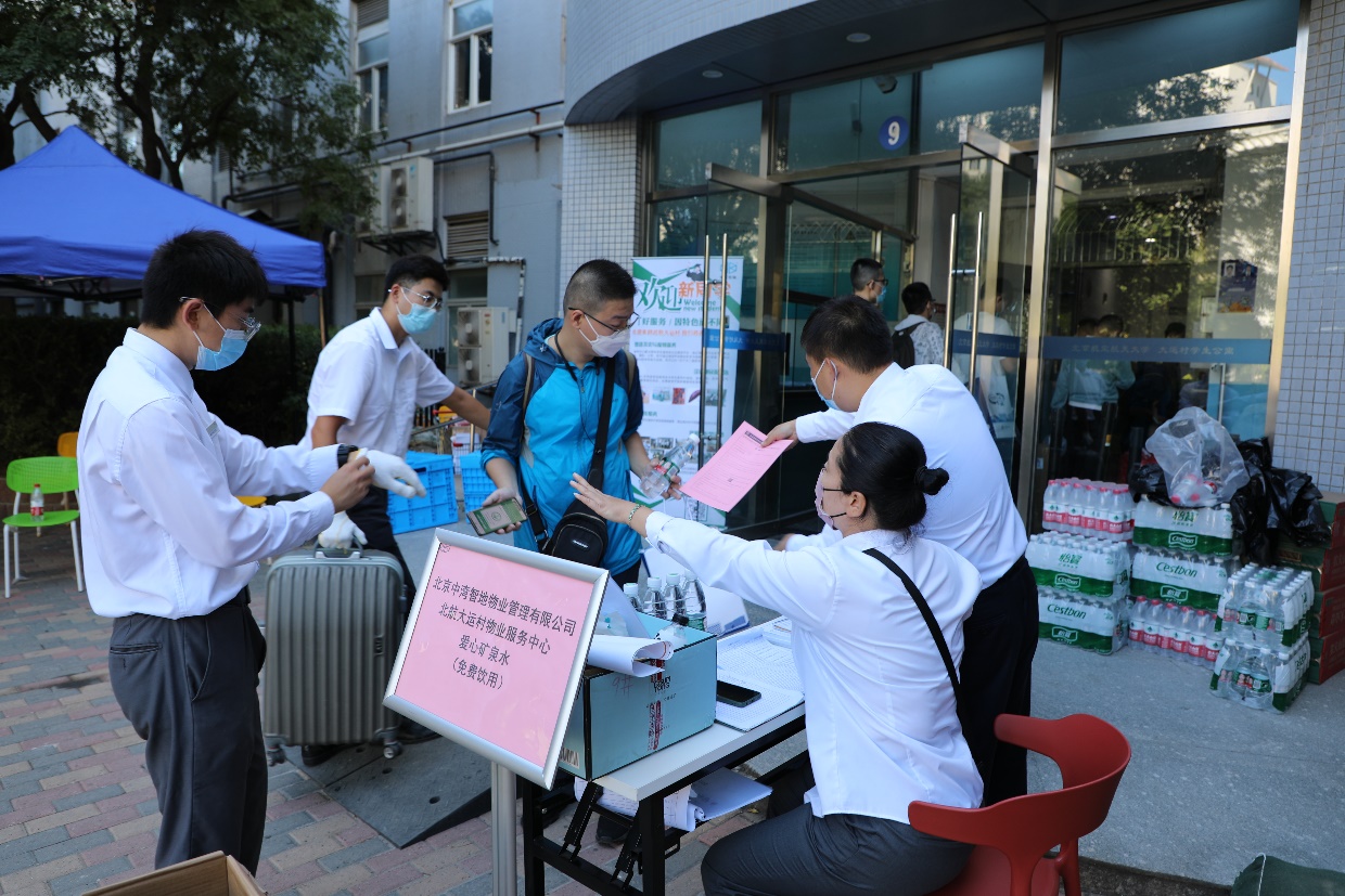 在宿舍楼前、大厅内设置咨询台,帮助新生快速办理入住手续、接待新生咨询、负责电梯引导及行李搬运等工作。宿舍楼内不间断消杀保障区域安全。用心用情为学生提供贴心、温暖的服务。