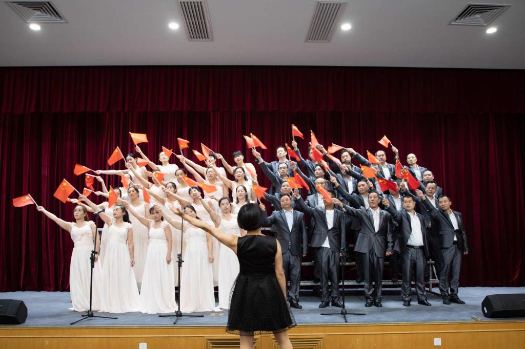 合唱汇演正式开始,7支合唱队伍陆续登台献歌。后勤保障处班子成员深情朗诵《祖国,我爱你》,与后勤机关、优购行政员工合唱《我们走在大路上》,熟悉的旋律让我们仿佛又回到了那段峥嵘岁月。《我的中国心》、《中国中国鲜红的太阳永不落》、《没有共产党就没有新中国》等一首首耳熟能详的歌曲,不断唱响在报告厅里,在座的每一位后勤职工都心情澎湃。合唱汇演在全体人员《歌唱祖国》的歌声中达到了高潮,大家共同挥动着手中的国旗,表达着对伟大祖国的热爱和祝福。