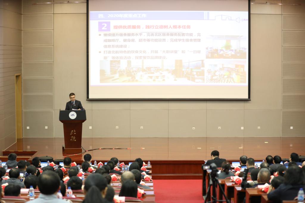会上,高常忠处长作后勤保障处(社区管理服务办公室)2019年度总结表彰大会报告,总结2019年工作和展望谋划2020年任务。同时,结合落实“不忘初心、牢记使命”主题教育及中央、学校要求等方面,他和大家交流分享几点思考,总结为“四个三”:回顾北航后勤发展三阶段历史、落实中央“三全育人”要求、建设“三个北航”和实现“三个转变”。他指出,后勤人要坚持以习近平新时代中国特色社会主义思想为指导,以创新的思路科学谋划、积极实干,踏实做好后勤和社区的各项工作。